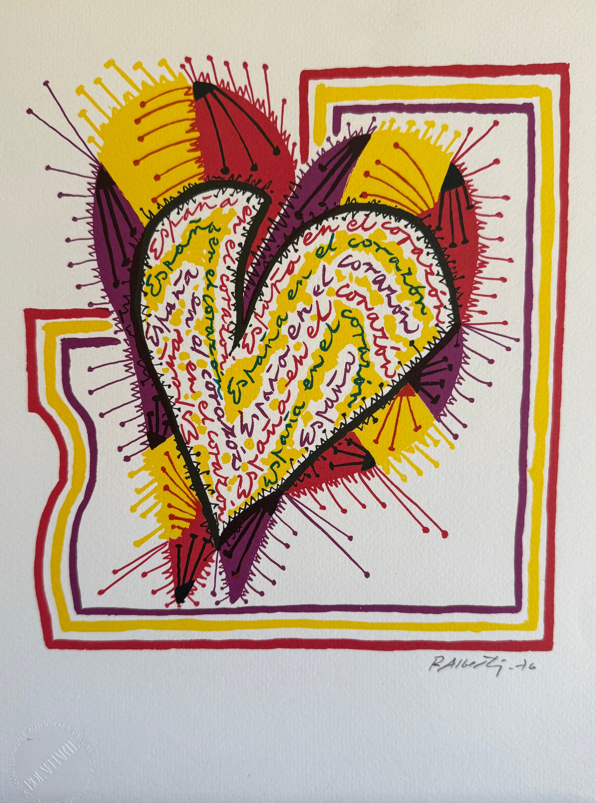 L’opera Cuori di Rafael Alberti è una fotolitografia a cinque colori, realizzata nel 1976 appositamente per la collezione Le carte da gioco di Bolaffi Arte.